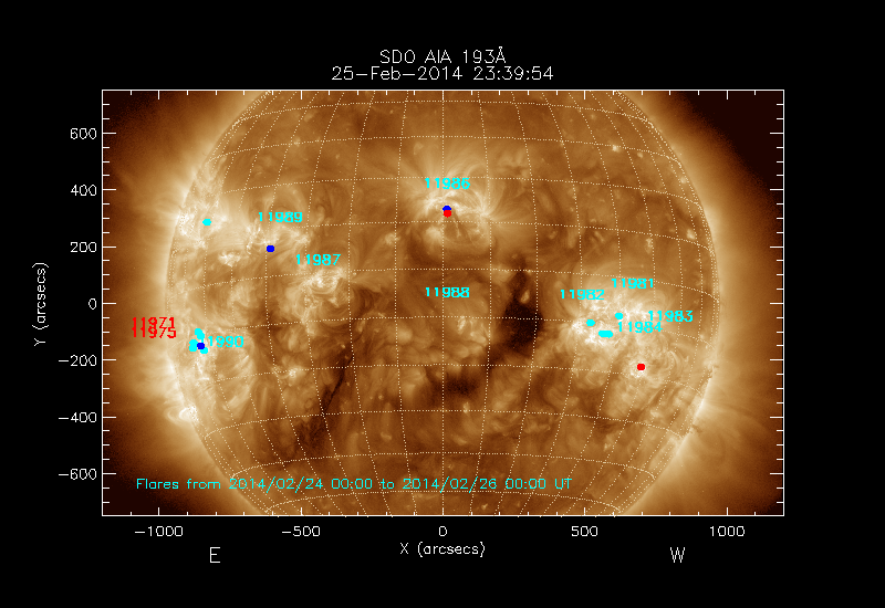All soft X-ray flares (≥A1.0) where the location has been determined are shown; the flare locations are rotated to the time of the image