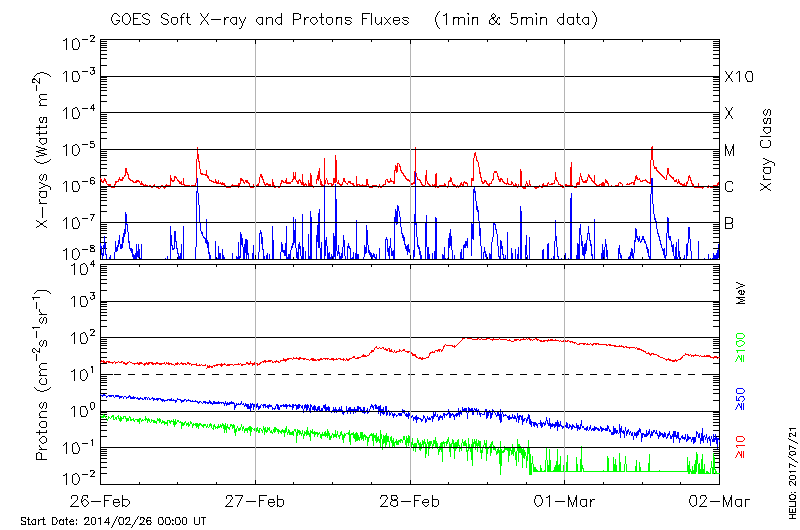 This page provides light-curves generated from GOES soft X-ray and Particle data for the date indicated at the top and the preceding three days.