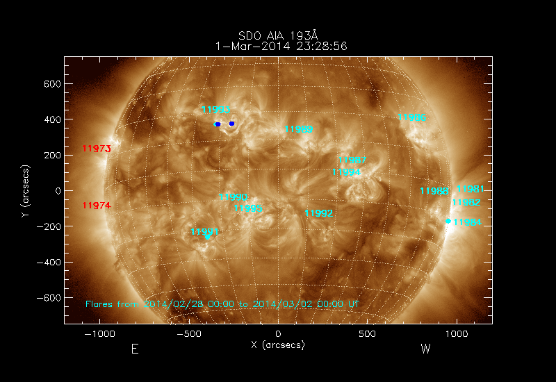All soft X-ray flares (≥A1.0) where the location has been determined are shown; the flare locations are rotated to the time of the image