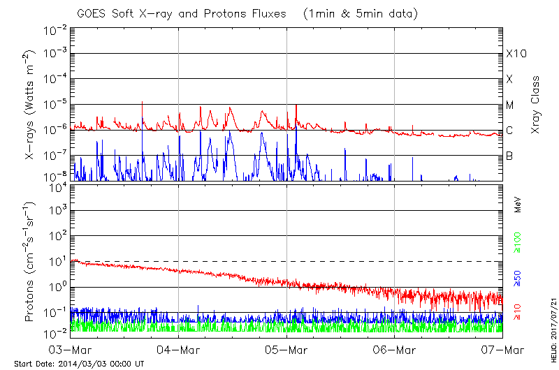 This page provides light-curves generated from GOES soft X-ray and Particle data for the date indicated at the top and the preceding three days.