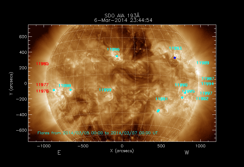 All soft X-ray flares (≥A1.0) where the location has been determined are shown; the flare locations are rotated to the time of the image