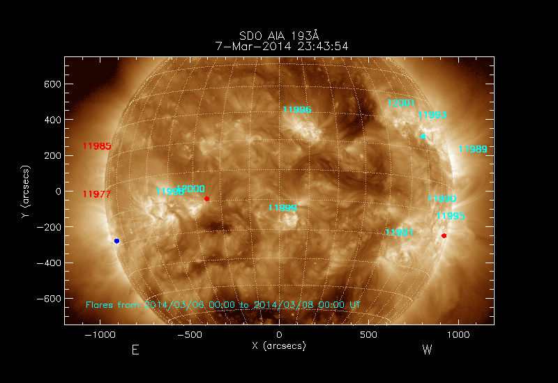 All soft X-ray flares (≥A1.0) where the location has been determined are shown; the flare locations are rotated to the time of the image