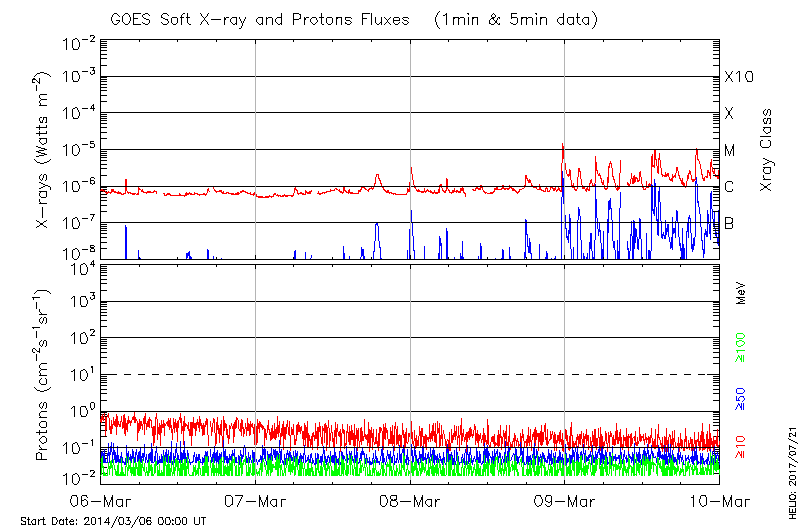 This page provides light-curves generated from GOES soft X-ray and Particle data for the date indicated at the top and the preceding three days.