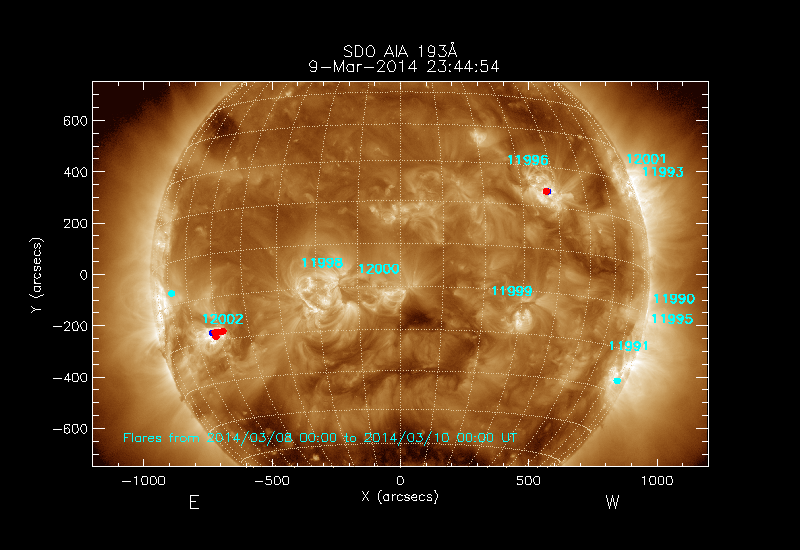 Flares for the 48 hours leading up to the time are over-plotted; these are rotated to the time of the FITS image.
