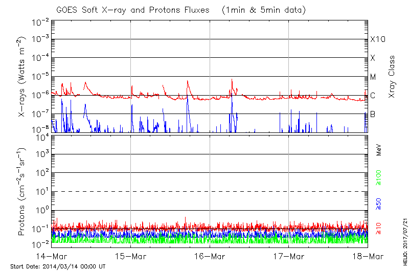This page provides light-curves generated from GOES soft X-ray and Particle data for the date indicated at the top and the preceding three days.