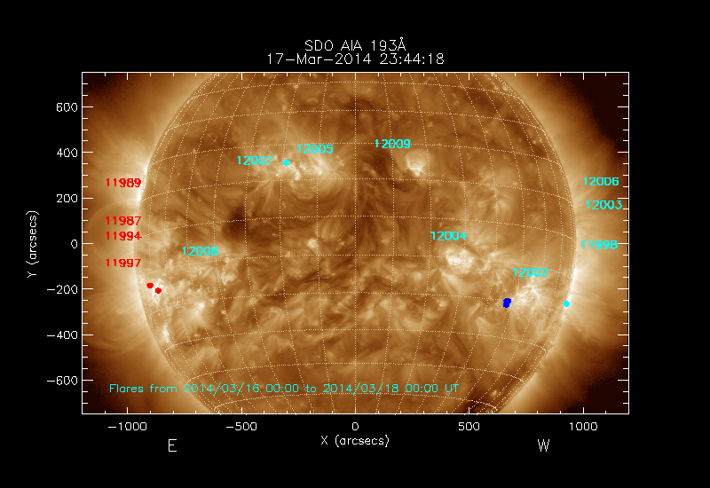 All soft X-ray flares (≥A1.0) where the location has been determined are shown; the flare locations are rotated to the time of the image