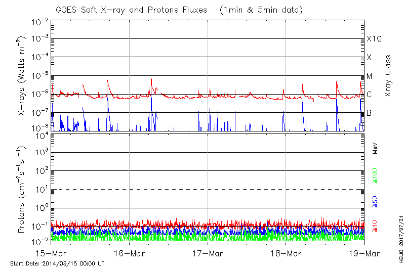 This page provides light-curves generated from GOES soft X-ray and Particle data for the date indicated at the top and the preceding three days.
