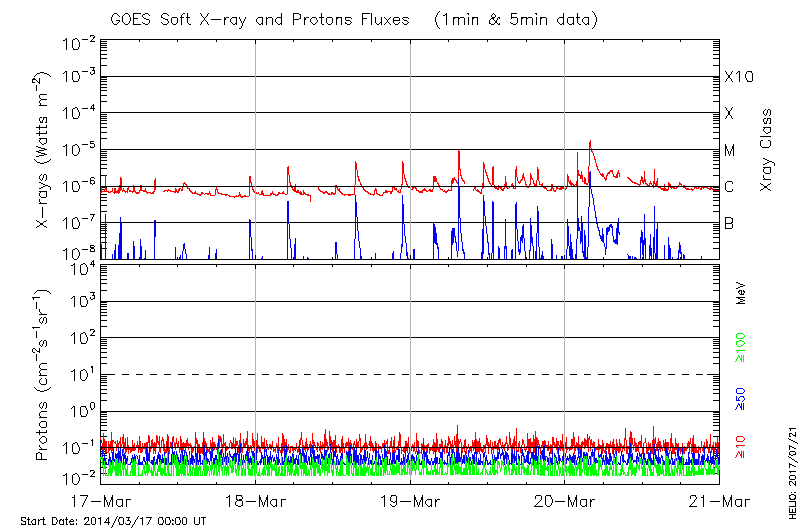 This page provides light-curves generated from GOES soft X-ray and Particle data for the date indicated at the top and the preceding three days.