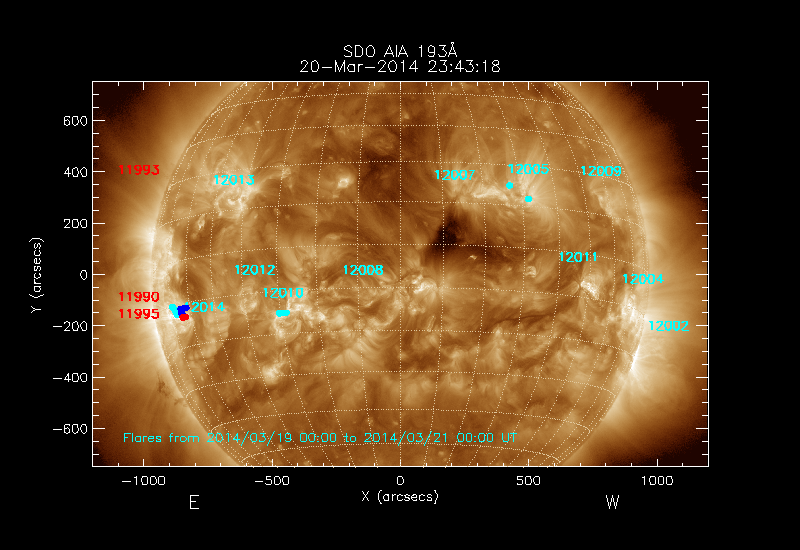 Click on an Active Region plot to display the Region Report including the region evolution and flaring history. HEC Search for NOAA Active Regions (SRS) records for this date and the day before.