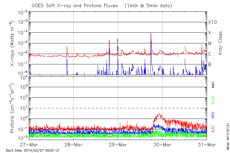 This page provides light-curves generated from GOES soft X-ray and Particle data for the date indicated at the top and the preceding three days.