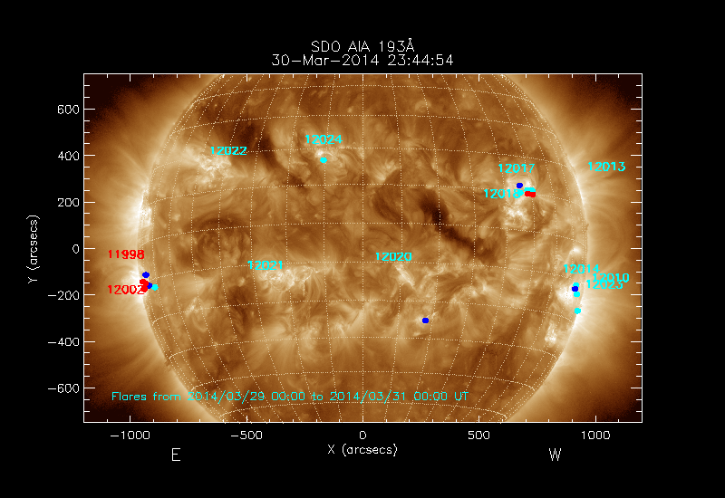 The most recent flares (≤12 hours) are shown as red dots, 12-24 hours ago as blue dots and older ones as turquoise dots.