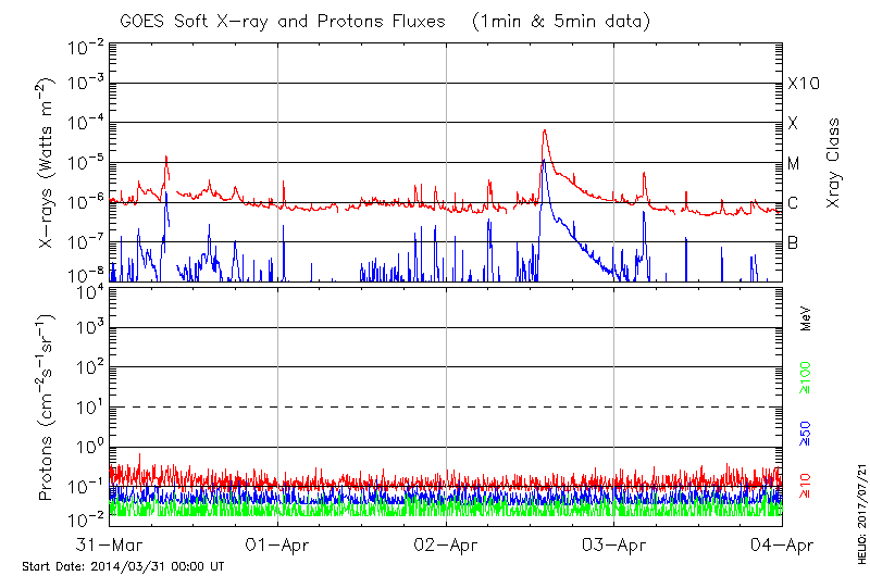 This page provides light-curves generated from GOES soft X-ray and Particle data for the date indicated at the top and the preceding three days.