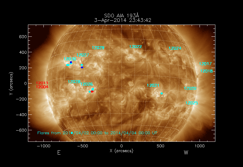 The locations of the flares over-plotted on the image are derived from the flare catalogue