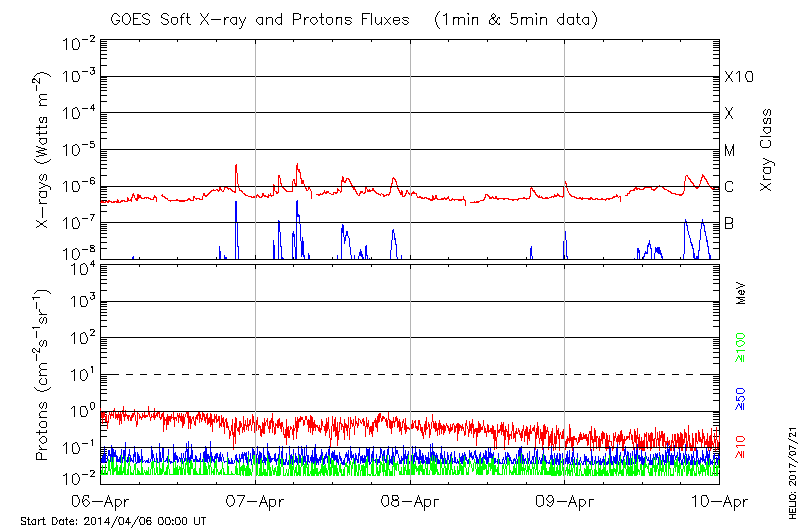 This page provides light-curves generated from GOES soft X-ray and Particle data for the date indicated at the top and the preceding three days.
