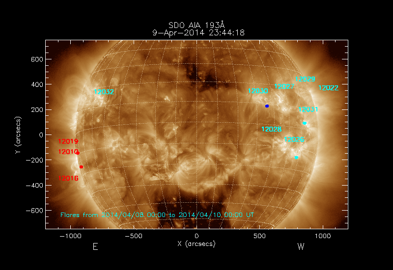 The locations of the flares over-plotted on the image are derived from the flare catalogue