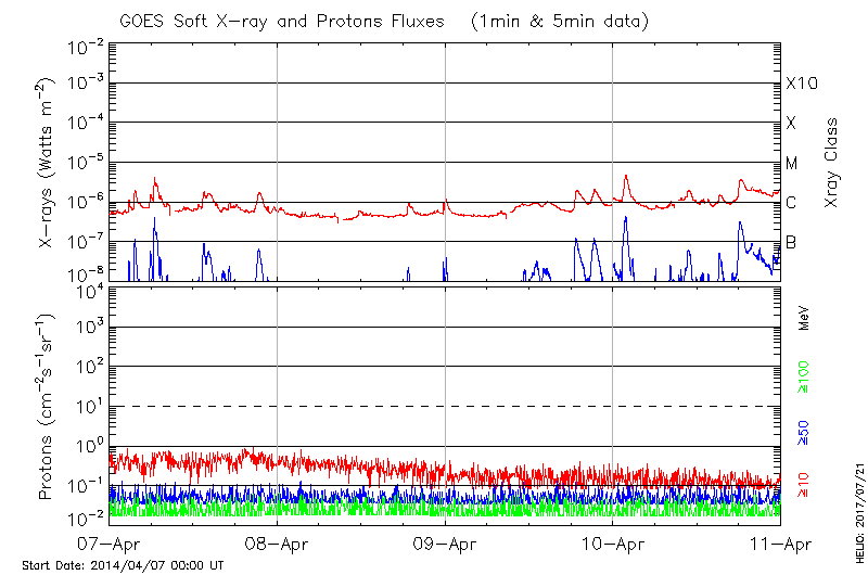 This page provides light-curves generated from GOES soft X-ray and Particle data for the date indicated at the top and the preceding three days.