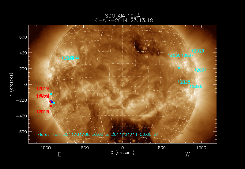 The locations of the flares over-plotted on the image are derived from the flare catalogue