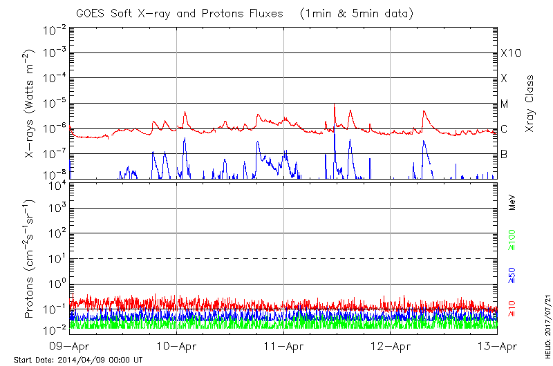 This page provides light-curves generated from GOES soft X-ray and Particle data for the date indicated at the top and the preceding three days.