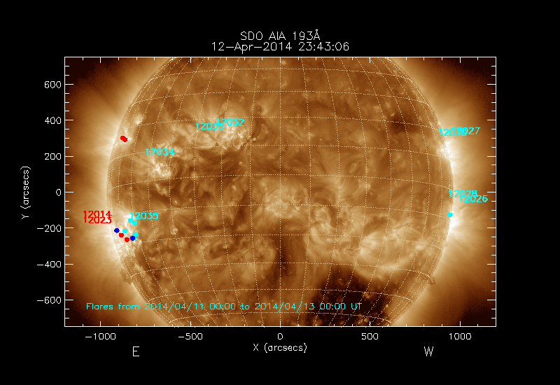 Flares for the 48 hours leading up to the time are over-plotted; these are rotated to the time of the FITS image.