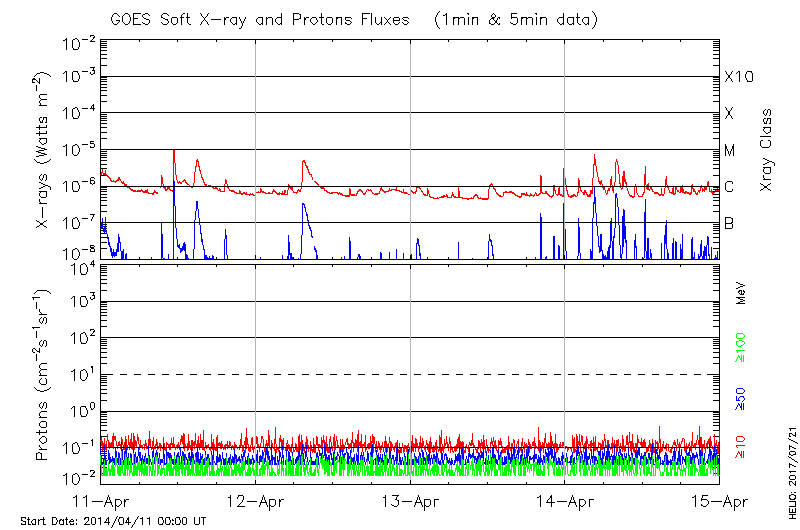 This page provides light-curves generated from GOES soft X-ray and Particle data for the date indicated at the top and the preceding three days.