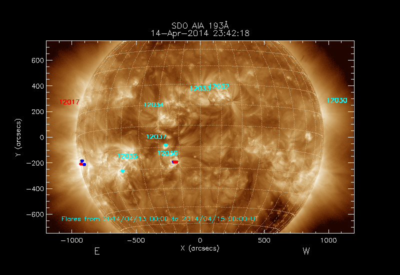 The locations of the flares over-plotted on the image are derived from the flare catalogue