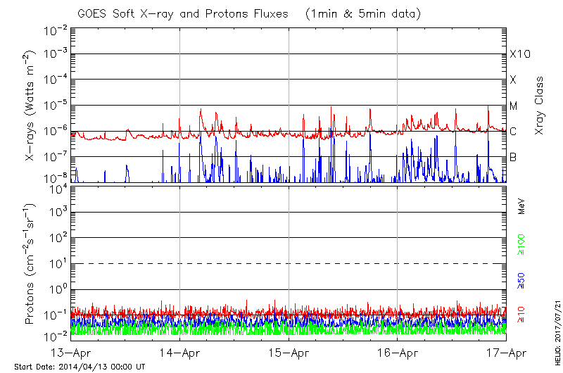 This page provides light-curves generated from GOES soft X-ray and Particle data for the date indicated at the top and the preceding three days.