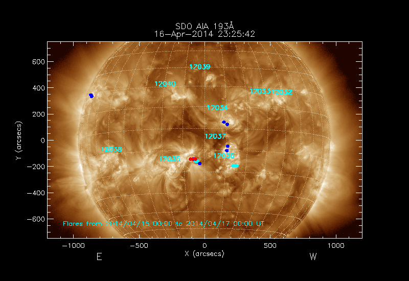 The most recent flares (≤12 hours) are shown as red dots, 12-24 hours ago as blue dots and older ones as turquoise dots.