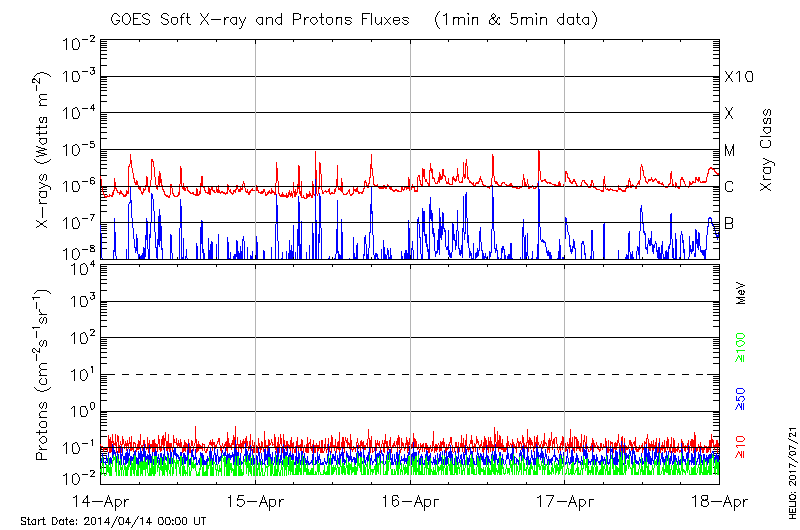 This page provides light-curves generated from GOES soft X-ray and Particle data for the date indicated at the top and the preceding three days.