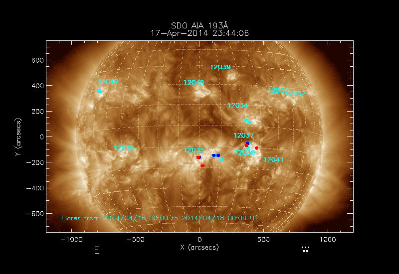 The most recent flares (≤12 hours) are shown as red dots, 12-24 hours ago as blue dots and older ones as turquoise dots.