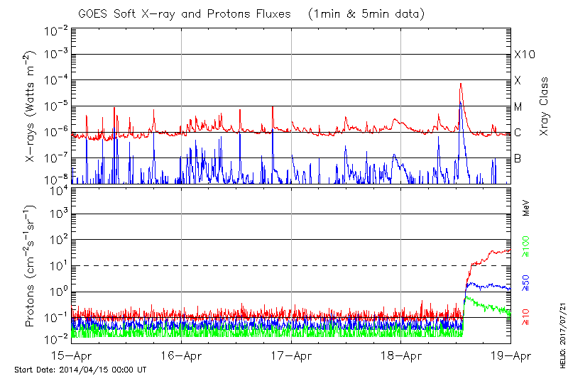This page provides light-curves generated from GOES soft X-ray and Particle data for the date indicated at the top and the preceding three days.