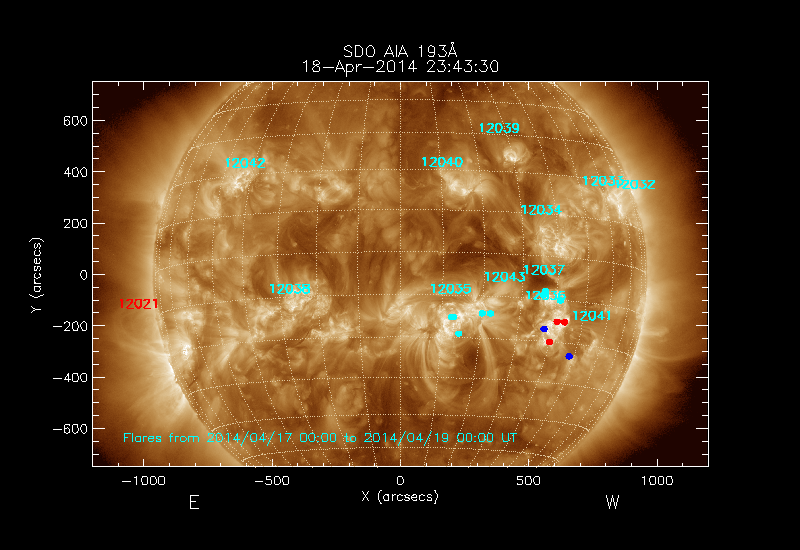 The most recent flares (≤12 hours) are shown as red dots, 12-24 hours ago as blue dots and older ones as turquoise dots.