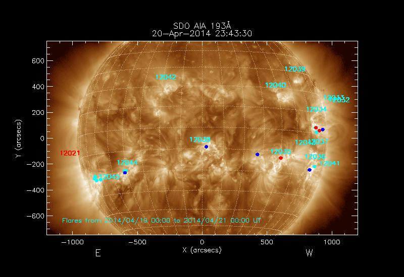 The locations of the flares over-plotted on the image are derived from the flare catalogue