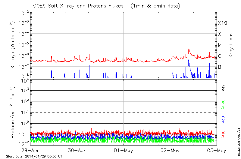 This page provides light-curves generated from GOES soft X-ray and Particle data for the date indicated at the top and the preceding three days.