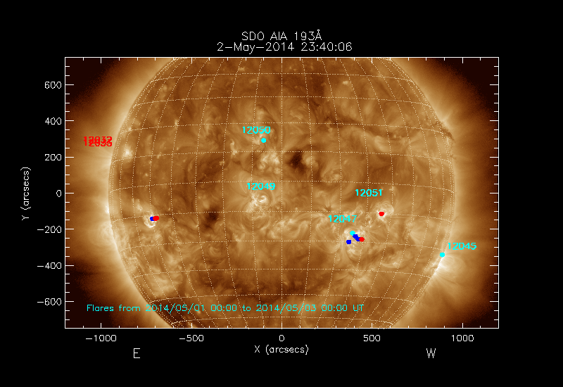 The locations of the flares over-plotted on the image are derived from the flare catalogue