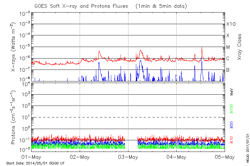 This page provides light-curves generated from GOES soft X-ray and Particle data for the date indicated at the top and the preceding three days.