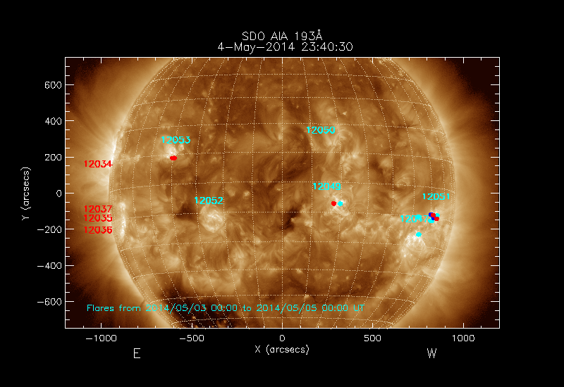 The locations of the flares over-plotted on the image are derived from the flare catalogue