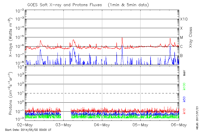 This page provides light-curves generated from GOES soft X-ray and Particle data for the date indicated at the top and the preceding three days.