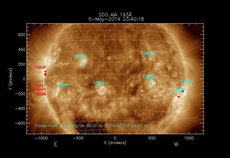 The locations of the flares over-plotted on the image are derived from the flare catalogue
