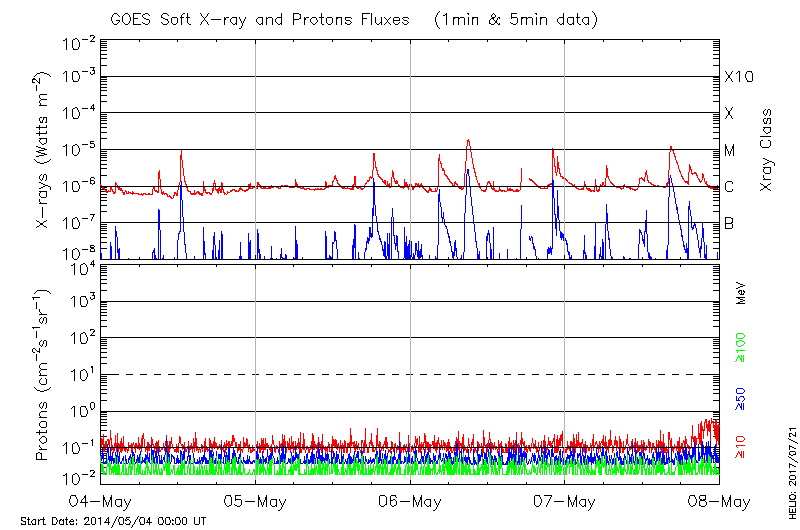 This page provides light-curves generated from GOES soft X-ray and Particle data for the date indicated at the top and the preceding three days.