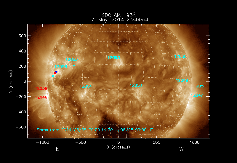 The locations of the flares over-plotted on the image are derived from the flare catalogue
