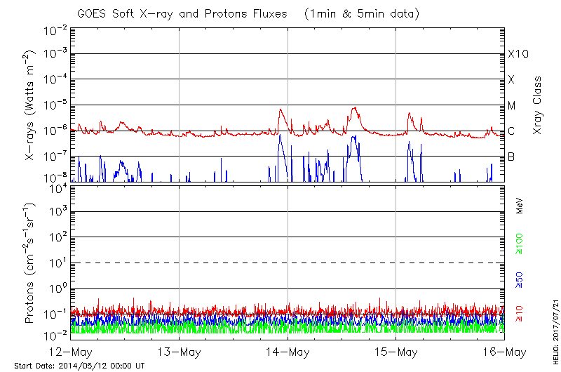 This page provides light-curves generated from GOES soft X-ray and Particle data for the date indicated at the top and the preceding three days.
