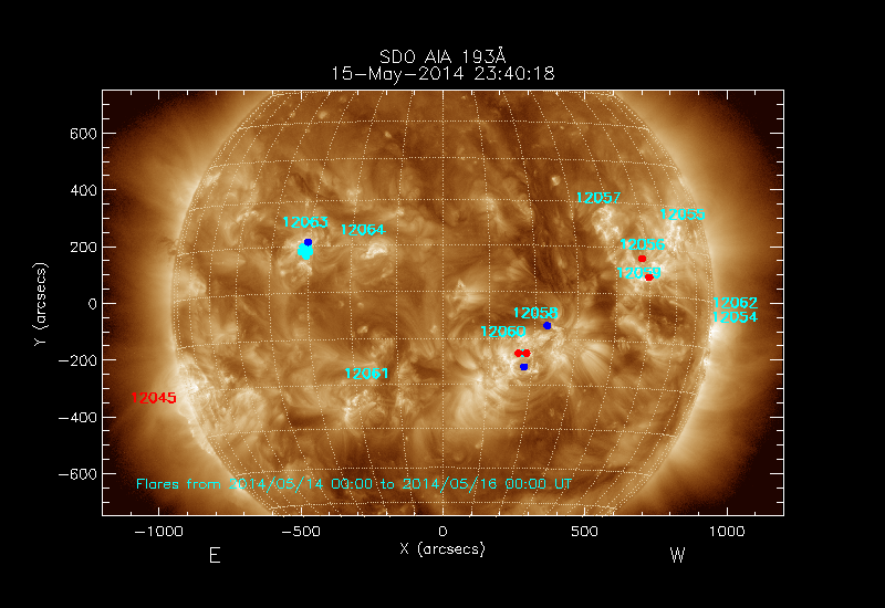 The most recent flares (≤12 hours) are shown as red dots, 12-24 hours ago as blue dots and older ones as turquoise dots.