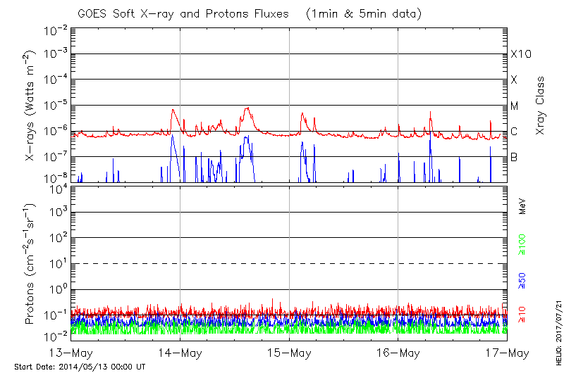 This page provides light-curves generated from GOES soft X-ray and Particle data for the date indicated at the top and the preceding three days.