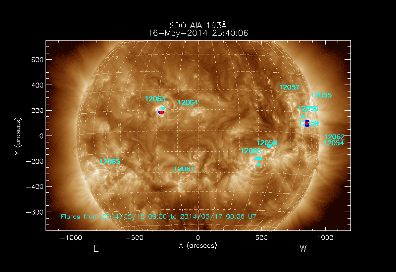 All soft X-ray flares (≥A1.0) where the location has been determined are shown; the flare locations are rotated to the time of the image