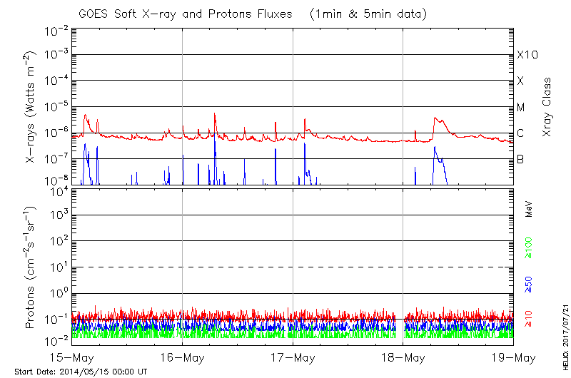 This page provides light-curves generated from GOES soft X-ray and Particle data for the date indicated at the top and the preceding three days.