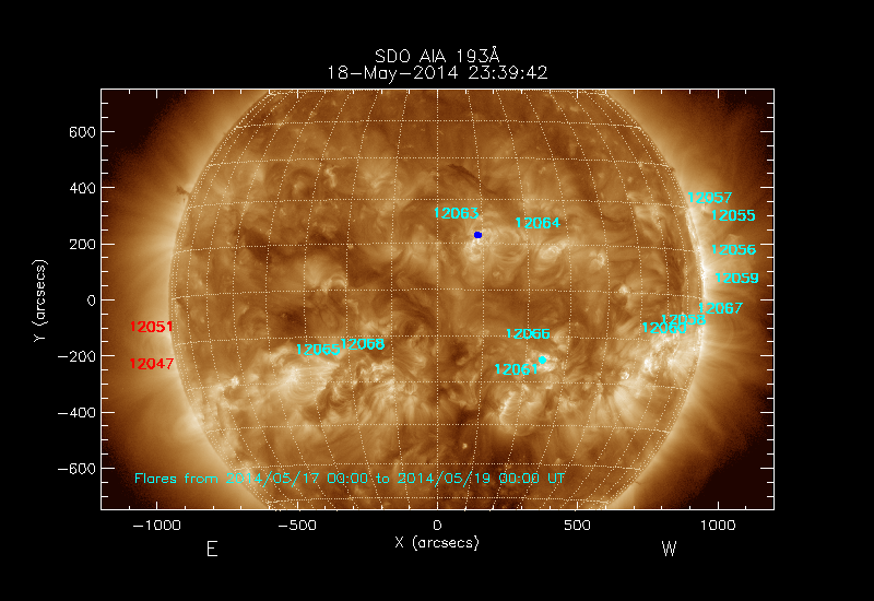 All soft X-ray flares (≥A1.0) where the location has been determined are shown; the flare locations are rotated to the time of the image