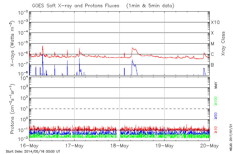 This page provides light-curves generated from GOES soft X-ray and Particle data for the date indicated at the top and the preceding three days.