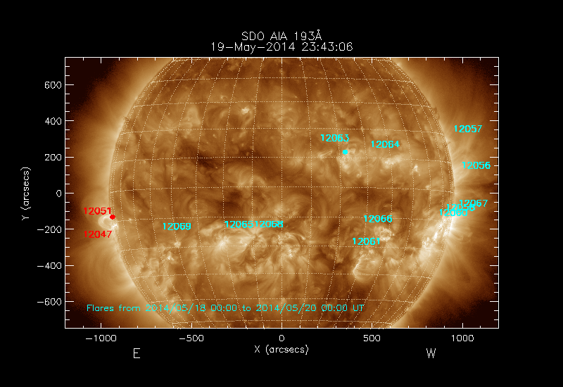 The locations of the flares over-plotted on the image are derived from the flare catalogue