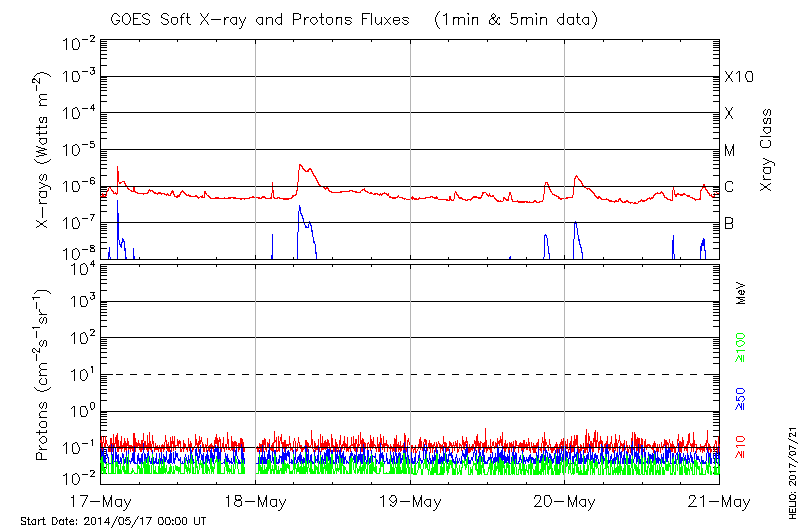 This page provides light-curves generated from GOES soft X-ray and Particle data for the date indicated at the top and the preceding three days.