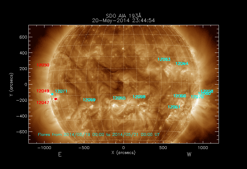 Click on an Active Region plot to display the Region Report including the region evolution and flaring history. HEC Search for NOAA Active Regions (SRS) records for this date and the day before.